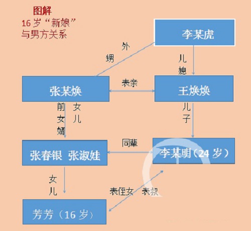 ▲图解16岁“新娘”芳芳和男方亲戚关系图。
