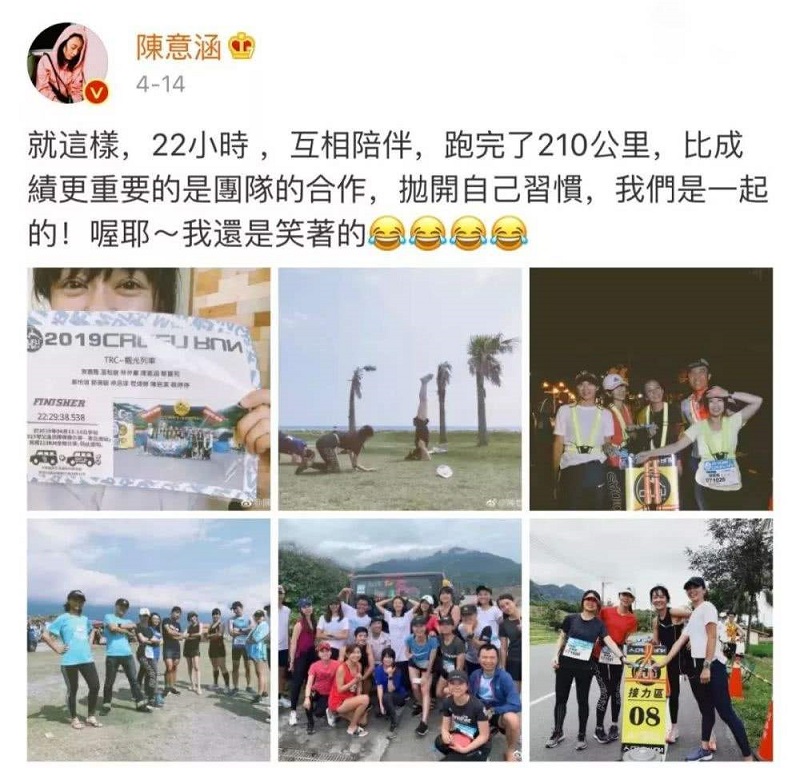 照片中,陈意涵穿着运动上衣和短裤,素颜出镜,笑得特别开心,并且配文,“就这样,22小时,互相陪伴,跑完了210公里,比成绩更重要的是团队的合作,抛开自己习惯,我们是一起的!”