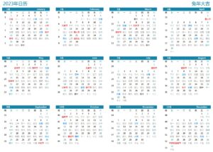 1公元2023年,公历平年,共365天,52周。全年为壬寅年腊月初十~癸卯年十一月十九) 1月1日~1月21日为壬寅年(虎年);1月22日~12月31日为癸卯年(兔年),闰二月(小),共384天。由于该年闰月,所以在农历的1年里有2个立春。故称为双春年。下面是2023日历、全年12个月日历大全。 2023年1-12月日历详情(包括2023农历和节假日) 202...