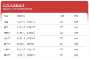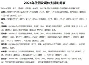 1近年来,放假成为了人们生活中不可或缺的一部分。放假不仅能让人们享受休闲时光,更能够为身心健康提供保障。因此,对于大多数人来说,了解明确的放假调休日历表是极其重要的。大福门DaFuMen.COM将为大家详细介绍2024年的放假调休日历表。 一、元旦节(1月1日) 2024年的元旦节是一个星期一,这意味着大多数人将会享受到一个长周末。在这个日子里,人们可以与家人...