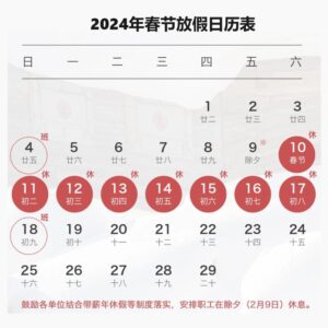 12024年春节是中国传统节日中最重要的节日之一。大福门DaFuMen.COM为您带来2024年春节放假日历表的详细信息。以下是关于2024年春节放假日程的安排: 2024年的春节,也被称为农历新年,是中国农历中的庚子年。庚子年是一个十二生肖循环中的一年,象征着新的开始和机遇。根据中国传统习俗,春节通常在农历正月初一开始,持续15天,直到正月十五元宵节结束。 ...