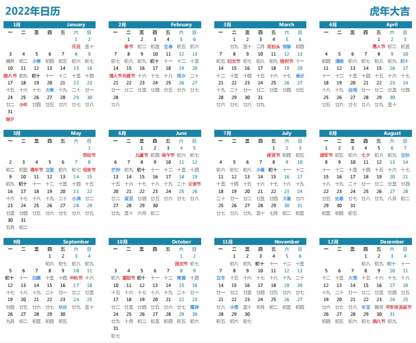 1公元2022年,公历平年,日历共365天,53周。农历壬寅年(虎年),无闰月,2022年农历日历共355天。中华人民共和国成立73周年。下面是2022日历、全年12个月日历大全 2022年1-12月日历详情(包括2022农历和节假日) 2022年1月日历 周 一 二 三 四 五 六 日 1 1休 元旦 2休 三十 2 3休 腊月 4 初二 5 小寒 6 初四...